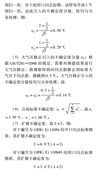 通過評定可得,開口 / 閉口閃點測定儀的不確定度主要來源于標準物質、重復性測量及點火測溫間隔引入的不確定度,溫度計顯示和大氣壓修正引入的標準不確定度較小。