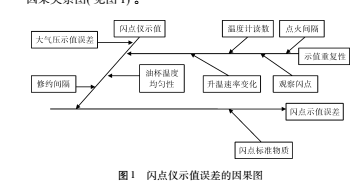 的過程中,大氣壓的示值誤差、油杯溫度均勻性、修約間隔以及重復性測量都會對閃點儀的示值產生影響,其中,升溫速率變化、氣壓變化、溫度計的讀數、觀察閃點、點火間隔都會對示值的重復性產生影響,其中,在實驗過程中,大氣壓變化較小,對測量結果影響可以忽略不計。現根據各不確定分量繪制因果關系圖( 見圖 1) 。