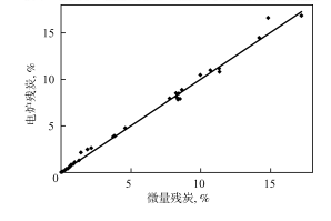 壞。對于催化裂化工藝的油漿、回煉油類樣品, 三種殘炭數據間的一致性較差。筆者認為,這既與油漿、回煉油類樣品的性質有關 , 又與三種殘炭測定方法的細節差異有關。